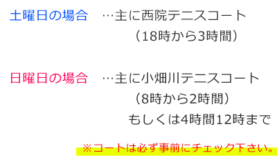 基本的に月4回(土曜日夜18時から3時間は右京区西院テニスコート、亀岡市運動公園、長岡京市の洛西浄化センターコート、日曜日朝8時、10時は2時間、もしくは4時間、西京区小畑川テニスコート)が主な練習場所です。